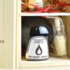 Este producto único y de alta calidad se entrega en una noble caja de madera hecha de la mejor madera de abeto lombardo. La botella está alojada en un pequeño bulto de lana de madera. Un original pitorro de corcho de vidrio ya está incluido con este producto y se sostiene festivamente con un lazo rojo.