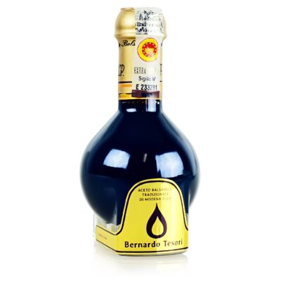 Obtenga una botella estrictamente limitada y numerada de 100 ml de este embotellado especial. Nuestra edición especial, el Bernardo Tesori en plata, es un original vinagre italiano tradicional, un Aceto Balsamico Tradizionale di Modena D.O.P. El producto se fabrica bajo el estricto control de Consorzio Produttori Antiche Acetaie y ha envejecido durante más de 12 años.